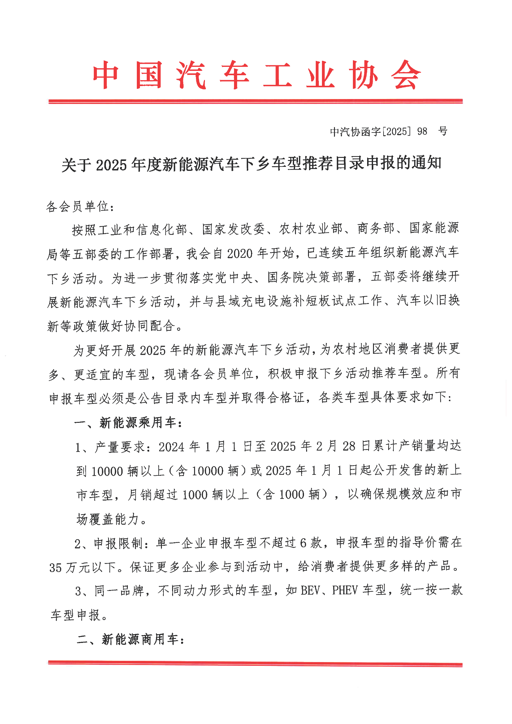 中国汽车工业协会关于转发五部门开展2025年新能源汽车下乡活动的通知