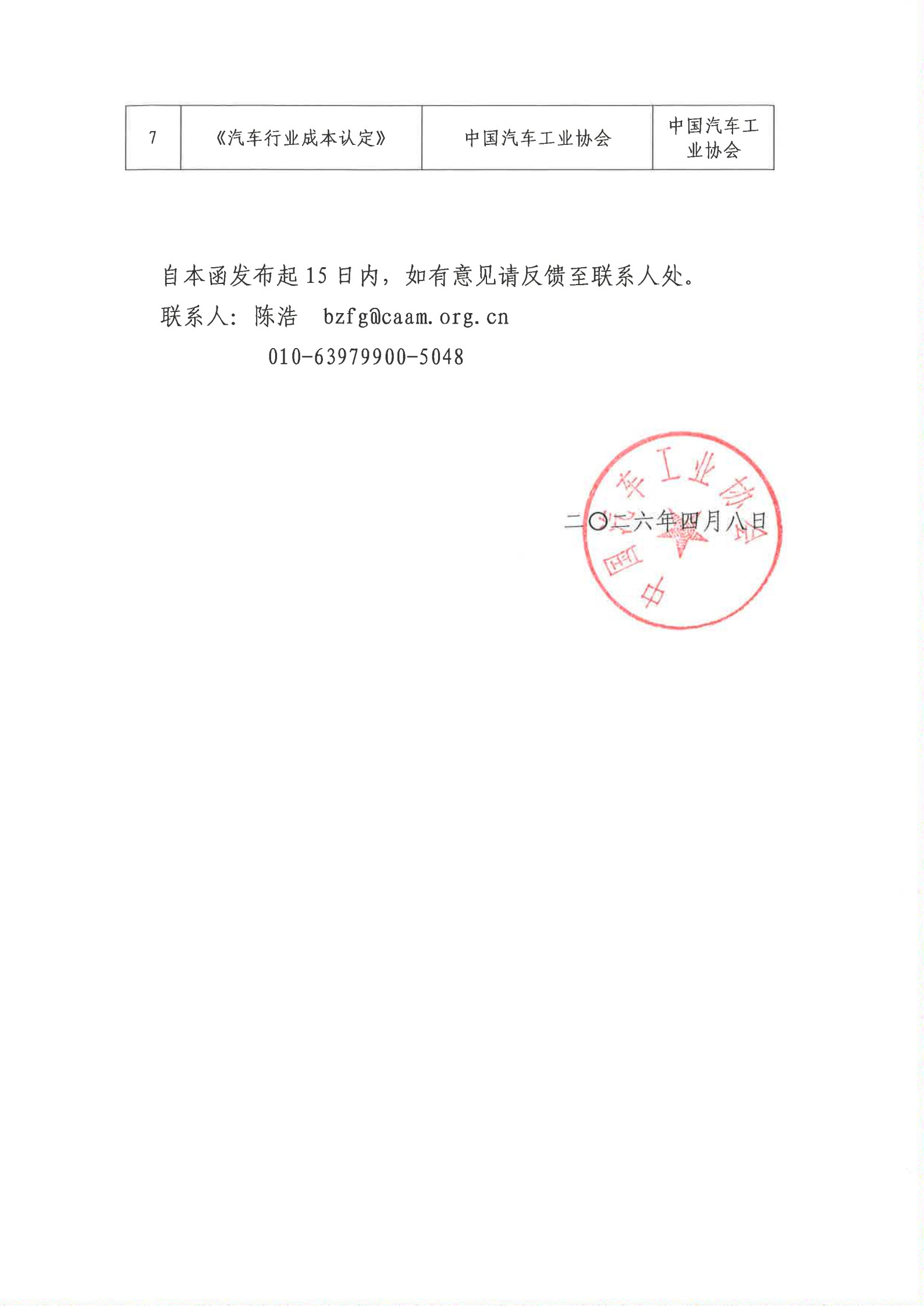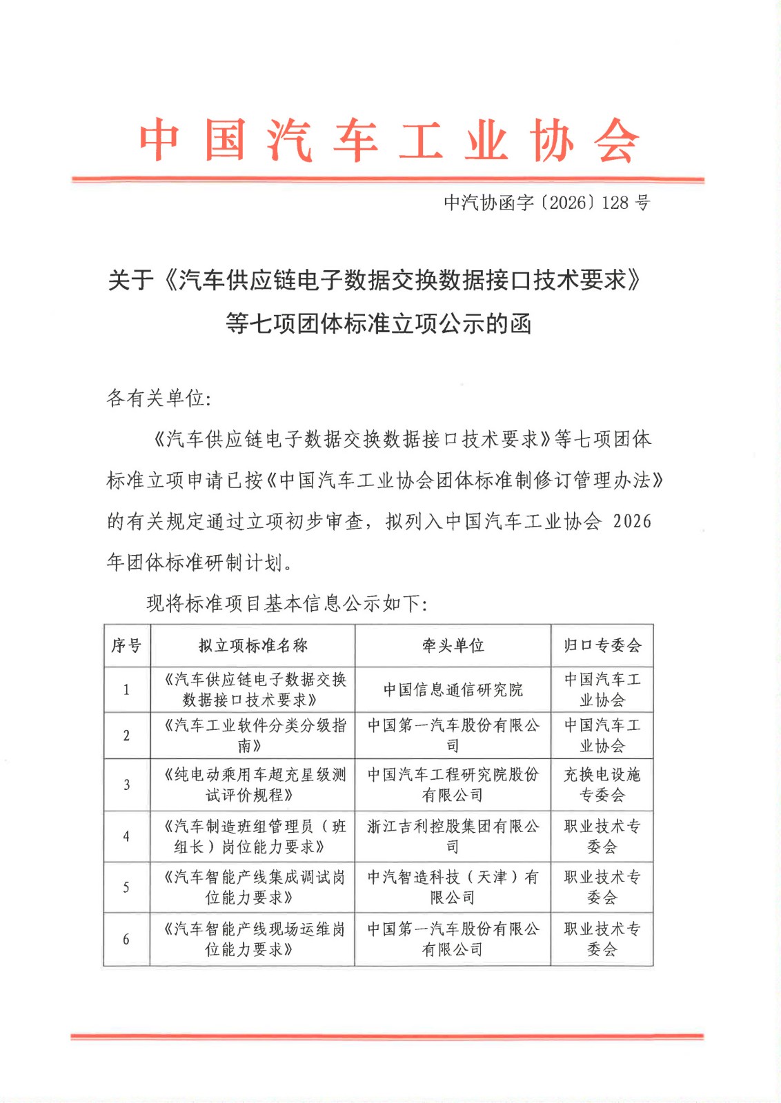 中国汽车工业协会关于《汽车供应链电子数据交换数据接口技术要求》等七项团体标准立项公示的函